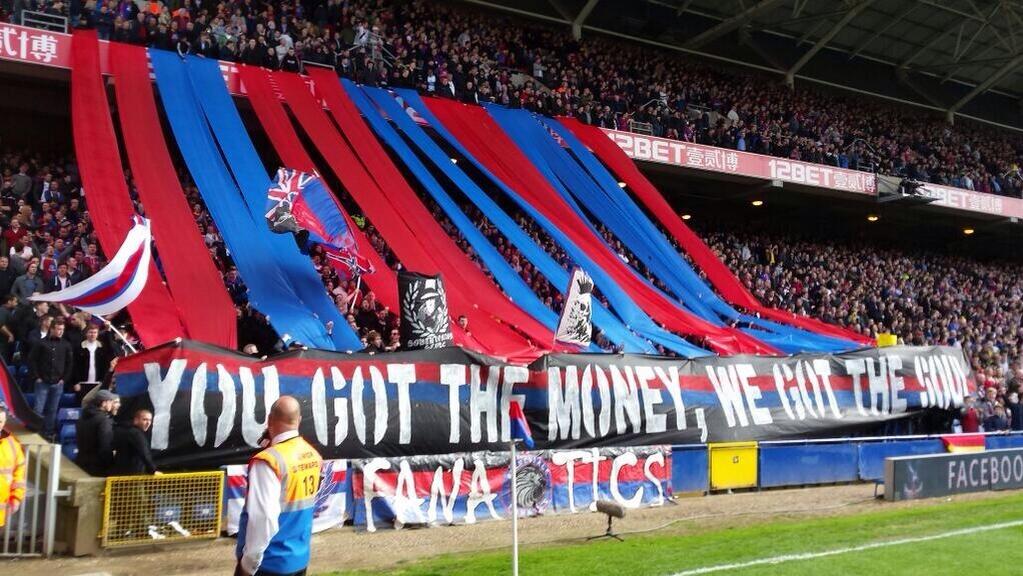 | Torcida do Crystal Palace com faixa contra o Manchester City no Selhurst Park |